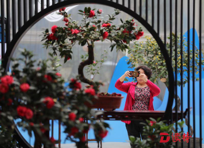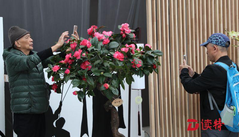 花卉館內(nèi)的室內(nèi)展區(qū)是此次茶花展的一大亮點。"佳境"、"夢境"、"意境"、"秘境"、"禪境"5個觀賞區(qū),營造出不同的茶花文化意境。其中"佳境"將擺放特色茶花盆栽,讓游人進入到茶花營造出的簡潔雅致的意境中;"夢境"利用"古樹"結(jié)合展示茶花插花藝術(shù),打造了夢幻的展示空間;"意境"以茶花切花花藝作品為主,結(jié)合茶花本身的特性與中式元素,展示意境唯美、充滿古韻的茶花插花作品。"我最喜歡‘秘境’,茶花盆景和山水盆景配上中式花幾和屏風,是濃縮的雅致山水呀。"63歲的孟先生由衷贊賞,"這是以情調(diào)韻味取勝,太美了!"而他的老伴喬阿姨則最喜歡"禪境":"茶花盆景搭配中式鏤空屏風,簡直像一幅畫,水中還有倒影虛實結(jié)合,很有意境!"