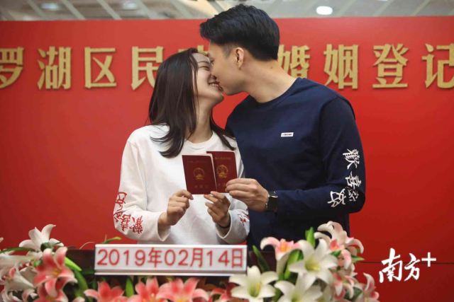 我們結(jié)婚啦!2月14日情人節(jié),一大早,深圳市羅湖區(qū)民政局婚姻登記處迎來許多對(duì)新人前來登記結(jié)婚。頒發(fā)證件、許下諾言、親密相吻……一對(duì)接一對(duì)的新人完成莊重的儀式,留下甜蜜蜜的合影,浪漫的氣息彌漫整個(gè)空間。南方日?qǐng)?bào)記者朱洪波攝影報(bào)道