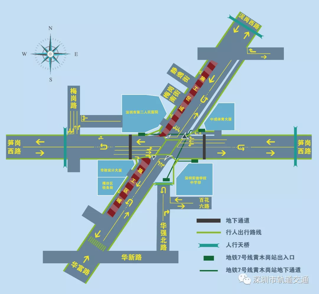 行人可利用平交路口、既有人行天橋、地下通道、地鐵7號(hào)線黃木崗站4個(gè)出入口過(guò)街。