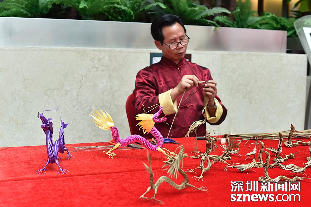 活動現(xiàn)場的草編藝人正在編織各種工藝品,草編在中國分布很廣,主要產區(qū)有山東、浙江、廣東、河南等地,在2008年入選第二批國家級非物質文化遺產名錄。