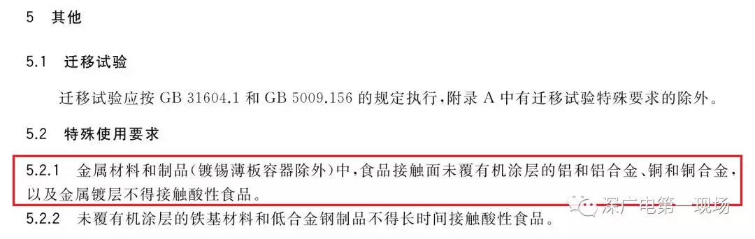 根據(jù)《食品安全國家標準食品接觸用金屬材料及制品》(GB4806.9-2016)規(guī)定,“金屬材料和制品(鍍錫薄板容器除外)中,食品接觸面未覆有機涂層的鋁和鋁合金、銅和銅合金,以及金屬鍍層不得接觸酸性食品?!?/p>