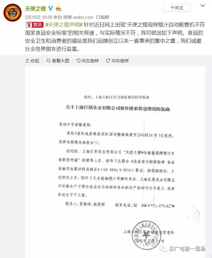 今天下午,深圳市市場稽查局出具書面回應,通報了相關情況: