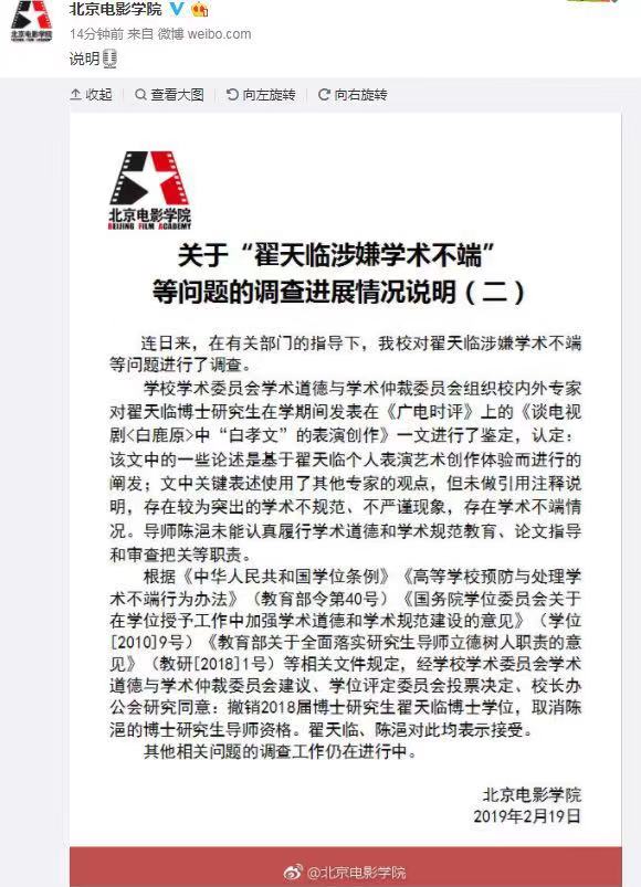 繼翟天臨退出北大博士后站之后,北電也于19號(hào)撤銷其博士學(xué)位了