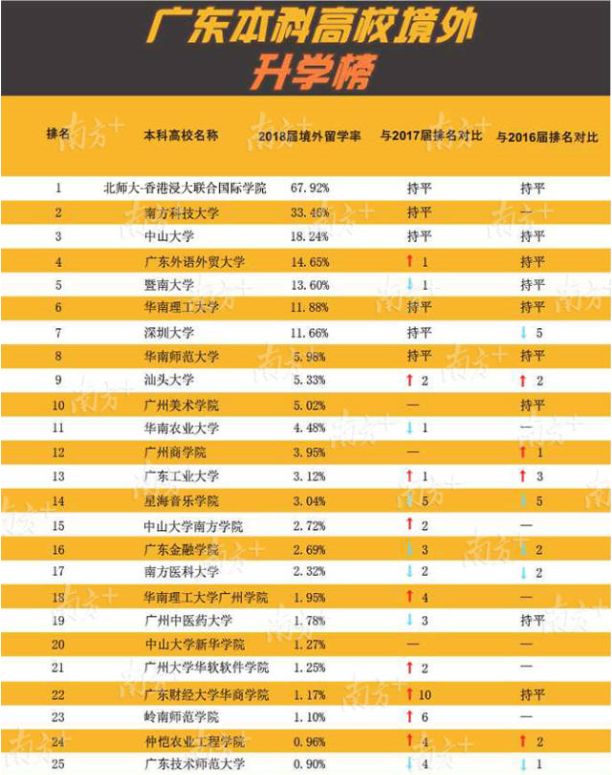 廣東外語外貿(mào)大學(xué)境外留學(xué)人數(shù)顯著提升,2018屆共有275人升入世界排名前100名的高校深造。兩所內(nèi)地與香港合作創(chuàng)辦的大學(xué)在境外留學(xué)率上處于全省前列。北京師范大學(xué)-香港浸會大學(xué)聯(lián)合國際學(xué)院持續(xù)多年保持全省第1位,此次共有811人留學(xué),其中481人就讀世界前100名的大學(xué)。香港中文大學(xué)(深圳)僅公布總升學(xué)率65.67%,該校就業(yè)處相關(guān)負責(zé)人介紹,升學(xué)率中絕大部分是境外留學(xué),176名學(xué)生平均每人收到3份世界知名大學(xué)錄取通知書。