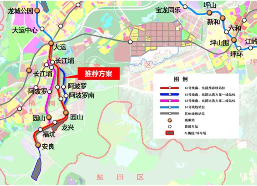 16號線南延對于支持重點產(chǎn)業(yè)區(qū)發(fā)展、強化龍崗中心城與橫崗、鹽田的區(qū)域聯(lián)系、構筑城際樞紐具有重要意義。線路從大運站引出,沿龍崗大道敷設,轉(zhuǎn)入長江埔路并設長江埔站,然后向南進入阿波羅產(chǎn)業(yè)園并設阿波羅站,繼續(xù)向南進入阿波羅產(chǎn)業(yè)區(qū)并設阿波羅南站,向南進入萬福路并設園山站,然后沿公園路敷設,轉(zhuǎn)入沙荷路在沙荷路與龍興路交叉口設龍興站,在沙荷路與安業(yè)路交叉口設??诱荆詈笱鼗蓰}中路進入安良村,設終點站安良站。線路全長約7.8km,采用地下敷設。