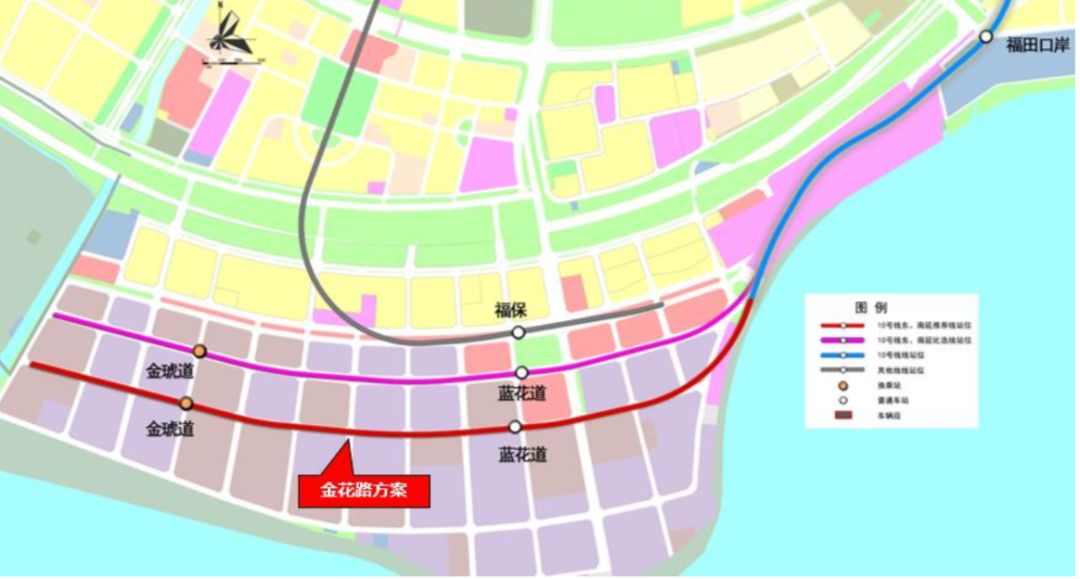 10號線南延是福田保稅區(qū)內(nèi)的普速線路,主要功能為聯(lián)系河套-福保片區(qū)的各功能區(qū)域,服務福田保稅區(qū)內(nèi)就業(yè)崗位。南延線線路起自在建10號線福田口岸站,向西南敷設,進入保稅區(qū)后沿金花路敷設,至藍花道設藍花道站,至金花路和平冠道交叉口設金琥道站,以金花路和金葵路交叉口為終點。線路全長約3.0km,采用地下敷設。