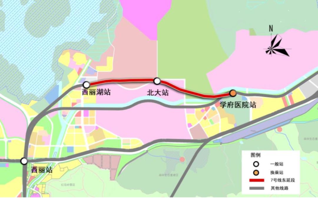 7號線東延起于既有7號線西麗湖站后,往東穿越深圳野生動物園,進入麗水路后于北大西門麗水路于西麗春園路交叉口處設置北大站,后穿過西麗高爾夫鄉(xiāng)村俱樂部與大沙河,于學苑大道與幽蘭路的交叉口設終點站學府醫(yī)院站。