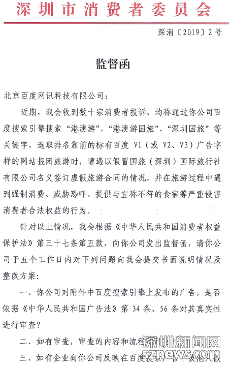 “野馬”旅行社屢禁不絕、愈演愈烈,不僅嚴(yán)重傷害了廣大消費(fèi)者,傷害了合法企業(yè)的正當(dāng)經(jīng)營,傷害了公平有序的市場競爭秩序,也傷害了深圳的城市形象,這其中,百度難辭其咎。一些不法分子利用百度信譽(yù)V認(rèn)證的核查漏洞和競價(jià)排名規(guī)則,把百度作為招徠客源的廣告投放平臺,對消費(fèi)者起到了極強(qiáng)的誤導(dǎo)作用。在此,深圳市消委會“三問百度”: