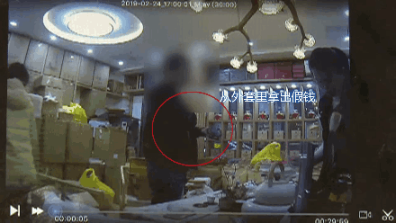 秦女士告訴記者,其實此時錢已經(jīng)被掉包了。從監(jiān)控視頻中可以發(fā)現(xiàn),這位顧客在秦女士去冰柜拿茶葉,小娟在檢查第一張100元時,疑似從外套里拿出了一張假幣壓在了錢包底下。