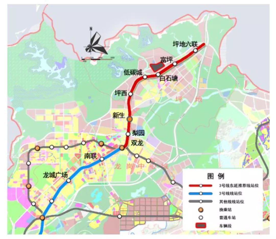 3號線東延線位于深圳市龍崗區(qū)境內,向東北方向延伸。線路全長約9.4公里,其中地上線約2.0公里,地下線約7.4公里。