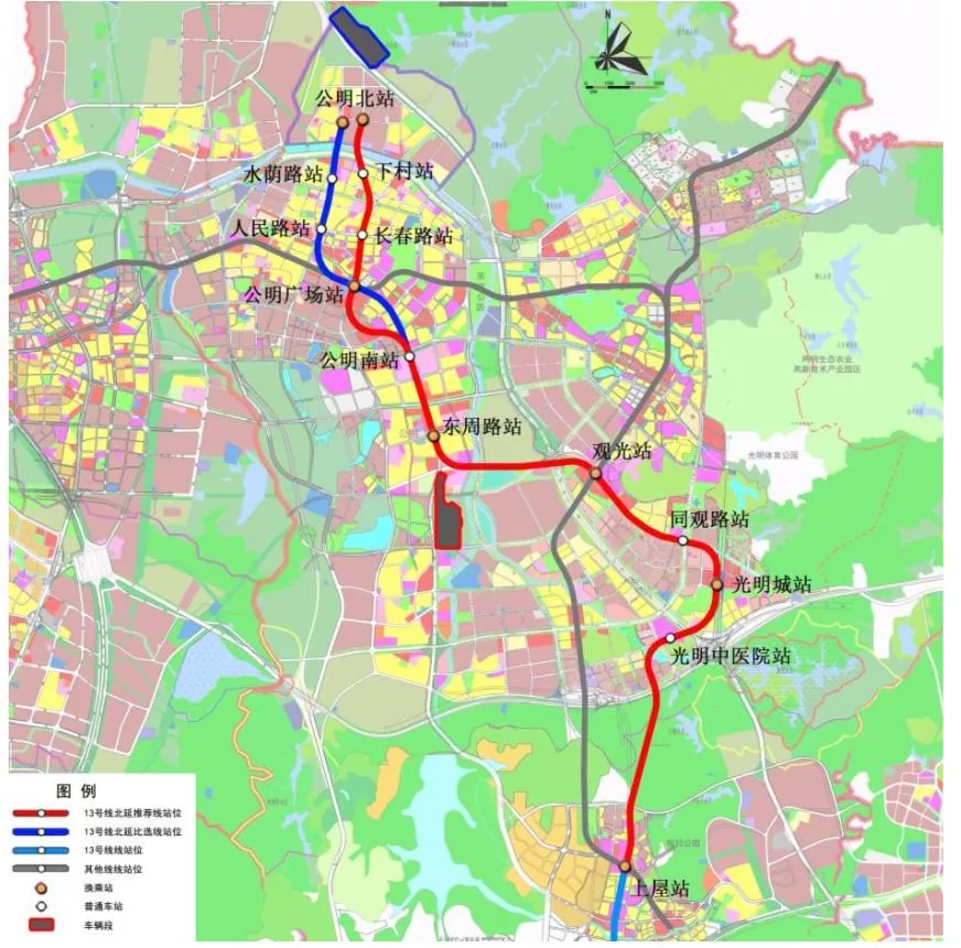 13號線北延線位于深圳市光明區(qū)境內,整個線路總體呈南北走向,終止于公明北站。線路全長約19.2公里,采用地下敷設。