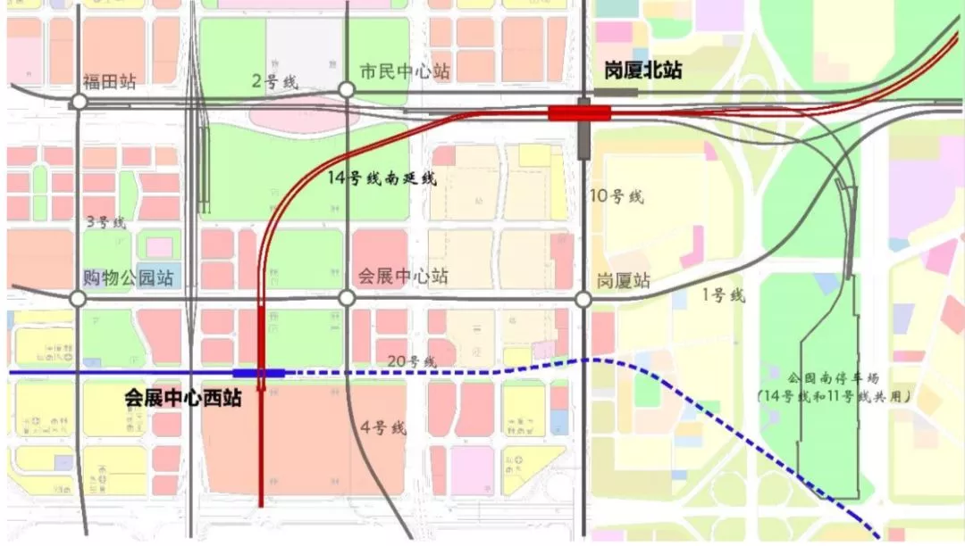 14號線南延從崗廈北站后折返線中部引出,下穿11號線右線和向南下穿市民中心南廣場,下穿4號線,下穿1號線至會展中心設會展中心站,與規(guī)劃20號線換乘。線路全長約1.3公里,采用地下敷設。