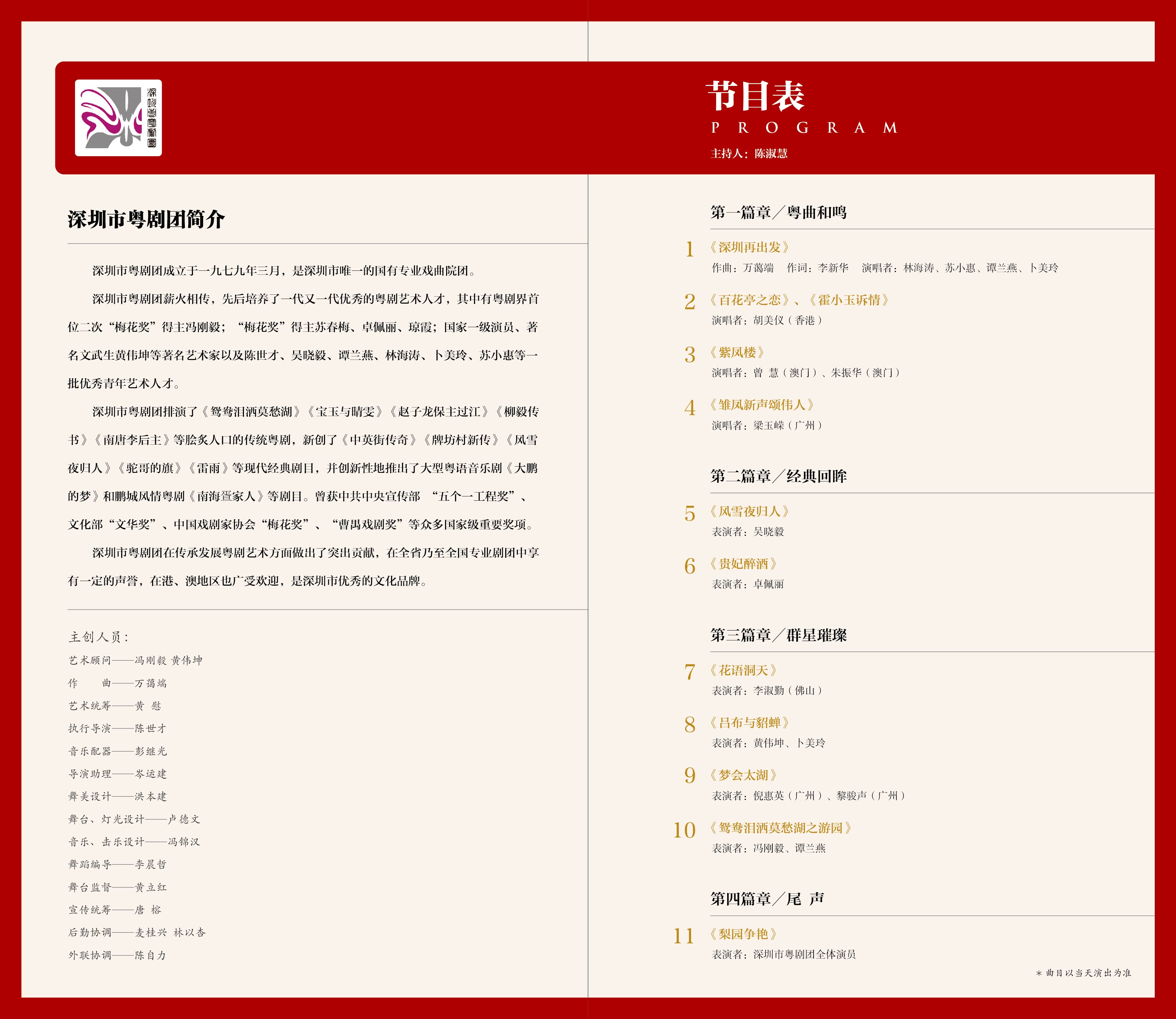 據(jù)悉,晚會(huì)劇目既有深圳粵劇團(tuán)原創(chuàng)經(jīng)典粵劇唱段,也有粵劇粵曲傳世名段,還有新創(chuàng)的現(xiàn)代和現(xiàn)實(shí)題材唱段。一首粵曲聯(lián)唱《深圳再出發(fā)》表達(dá)了藝術(shù)家們對(duì)深圳這座城市無限的熱愛和不變的情懷,唱響了整場(chǎng)演出的前奏;著名粵曲藝術(shù)家梁玉嶸經(jīng)典作品《雛鳳新聲頌偉人》,用優(yōu)美的曲調(diào)和真實(shí)的情感,歌頌偉人鄧小平的豐功偉績(jī);更有香港、澳門、廣州、深圳、佛山多地粵劇藝術(shù)家的拿手好戲:《夢(mèng)會(huì)太湖》(倪惠英、黎駿聲主演)、《鴛鴦淚灑莫愁湖之游湖》(馮剛毅、譚蘭英主演)、《花語洞天》(李淑琴主演)、《貴妃醉酒》(卓佩麗主演)、《呂布與貂蟬》(黃偉坤、卜美玲主演)、《風(fēng)雪夜歸人》(吳曉毅主演)等戲迷們耳熟能詳?shù)慕?jīng)典曲目精彩呈現(xiàn)。粵劇與粵曲、經(jīng)典與現(xiàn)代交相輝映,豪情鋪展新一輪深化國有文藝院團(tuán)改革后呈現(xiàn)出的欣欣向榮。