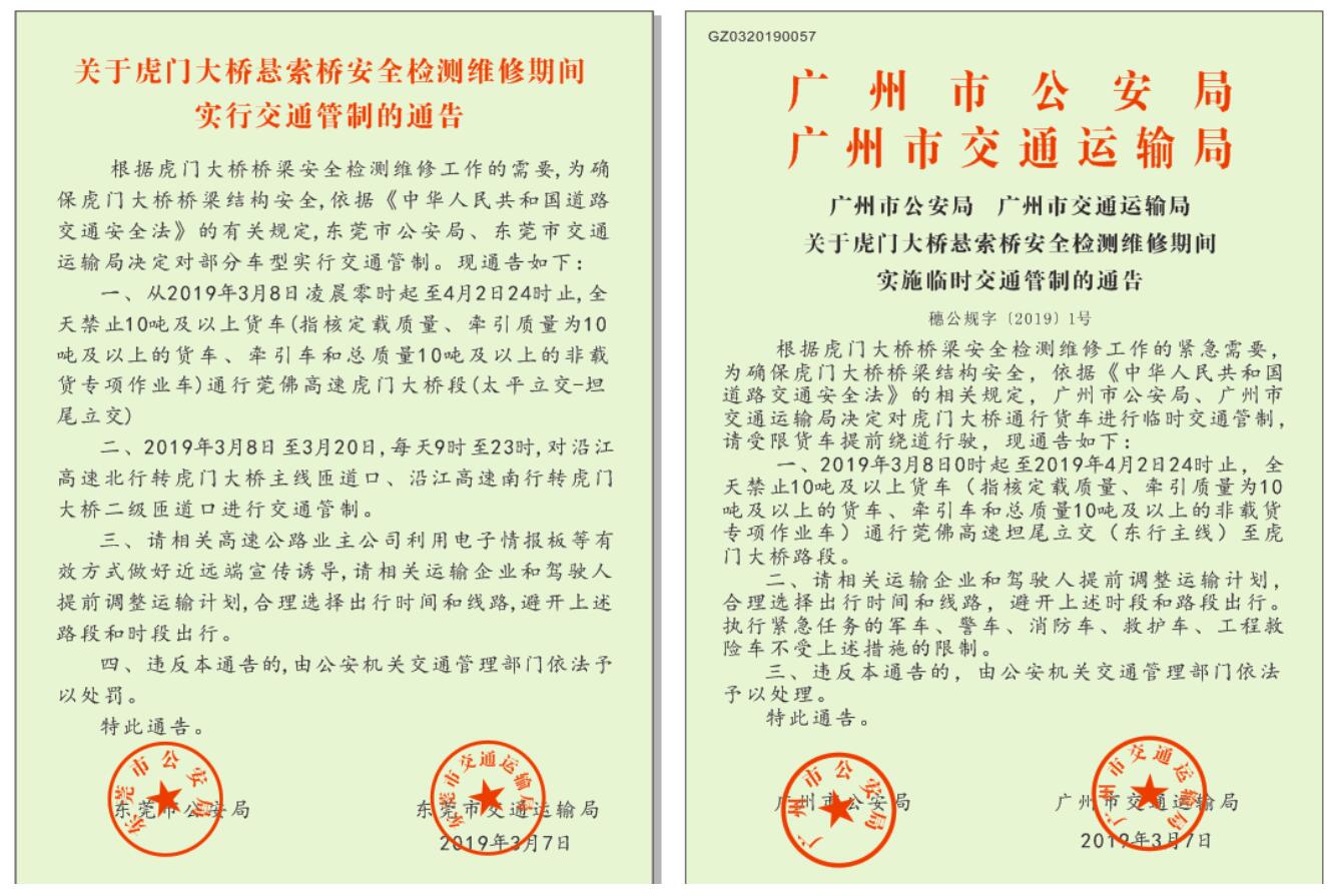 根據(jù)廣州市、東莞市兩地公安局和交通運(yùn)輸局通告,從2019年3月8日0時起至4月2日24時止,全天禁止10噸及以上貨車(指核定載質(zhì)量、牽引質(zhì)量為10噸及以上的貨車、牽引車和總質(zhì)量10噸及以上的非載貨專項(xiàng)作業(yè)車)通行莞佛高速虎門大橋段。