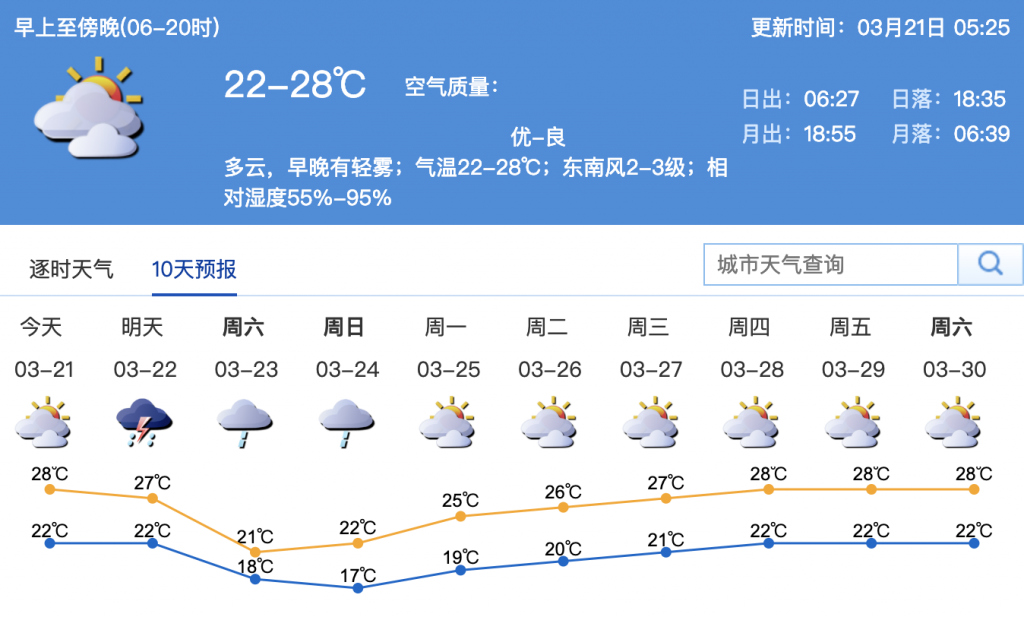 距離深圳平均入夏時(shí)間4月21日還有一個(gè)月,市民們也許已經(jīng)有了初夏般的感受。預(yù)計(jì)21日多云間陰天,早晚有輕霧,氣溫23~28 ℃。
