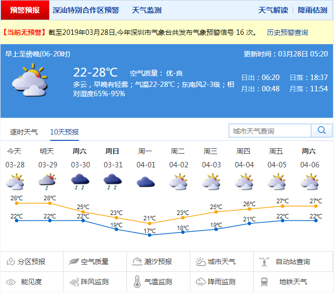 深圳新聞網(wǎng)2019年3月28日訊 深圳今日多云,早晚有輕霧或霧;20-27℃;南風2-3級;濕度60%-95%。預計29日多云轉(zhuǎn)陣雨;30-31日冷空氣影響,陰天有陣雨或雷陣雨,天氣轉(zhuǎn)涼;4月1日陰轉(zhuǎn)多云,偶有零星小雨;2日起氣溫逐日回升。