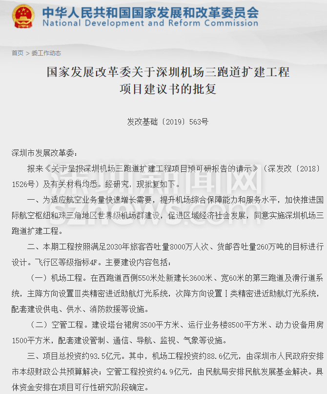 國家發(fā)展改革委關于深圳機場三跑道擴建工程項目建議書的批復截圖