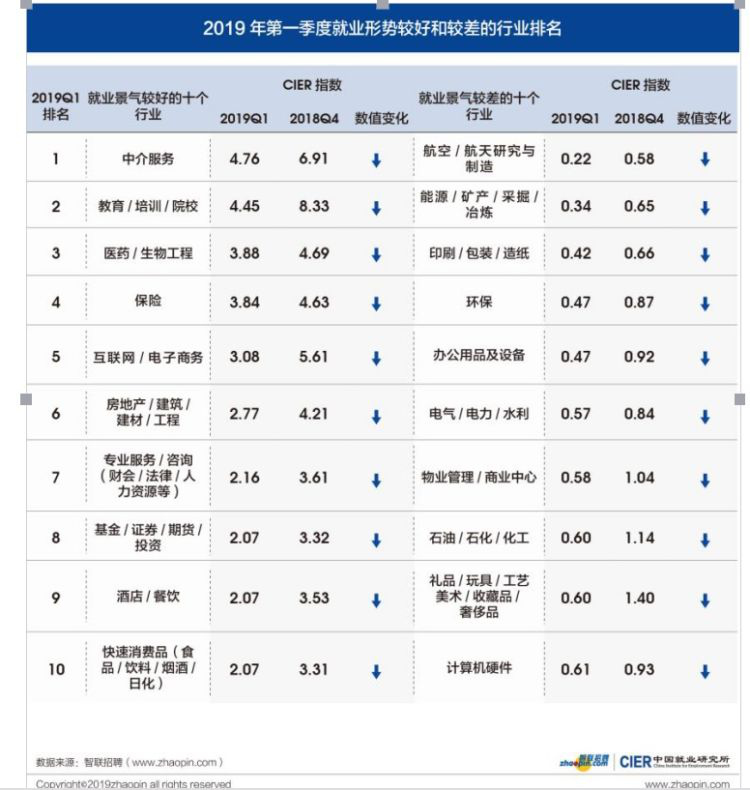 4月20日,智聯(lián)招聘發(fā)布2019年第一季度《中國(guó)就業(yè)市場(chǎng)景氣報(bào)告》。報(bào)告顯示,一季度就業(yè)景氣指數(shù)呈季節(jié)性下降,為1.68。本季度,教育 /培訓(xùn) /院校的招聘需求出現(xiàn)逆市上升,而金融業(yè)招聘職位數(shù)降幅在所有行業(yè)中最大。
