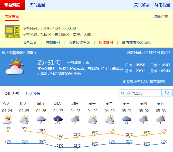深圳新聞網(wǎng)2019年4月24日訊 深圳市氣象局預(yù)計(jì)24日多云,中午前后悶熱,早晚有輕霧或霧,氣溫25-31℃;25-26日多云,局地有短時(shí)陣雨或雷陣雨;26日夜間至28日有一次雷雨過程,局地有大到暴雨。