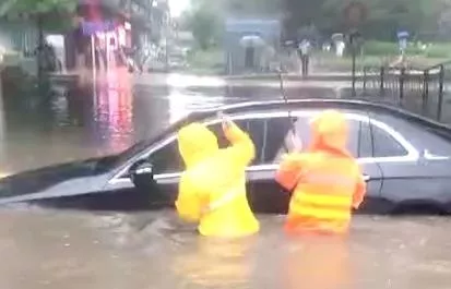 只見(jiàn)積水已經(jīng)浸沒(méi)半個(gè)車身