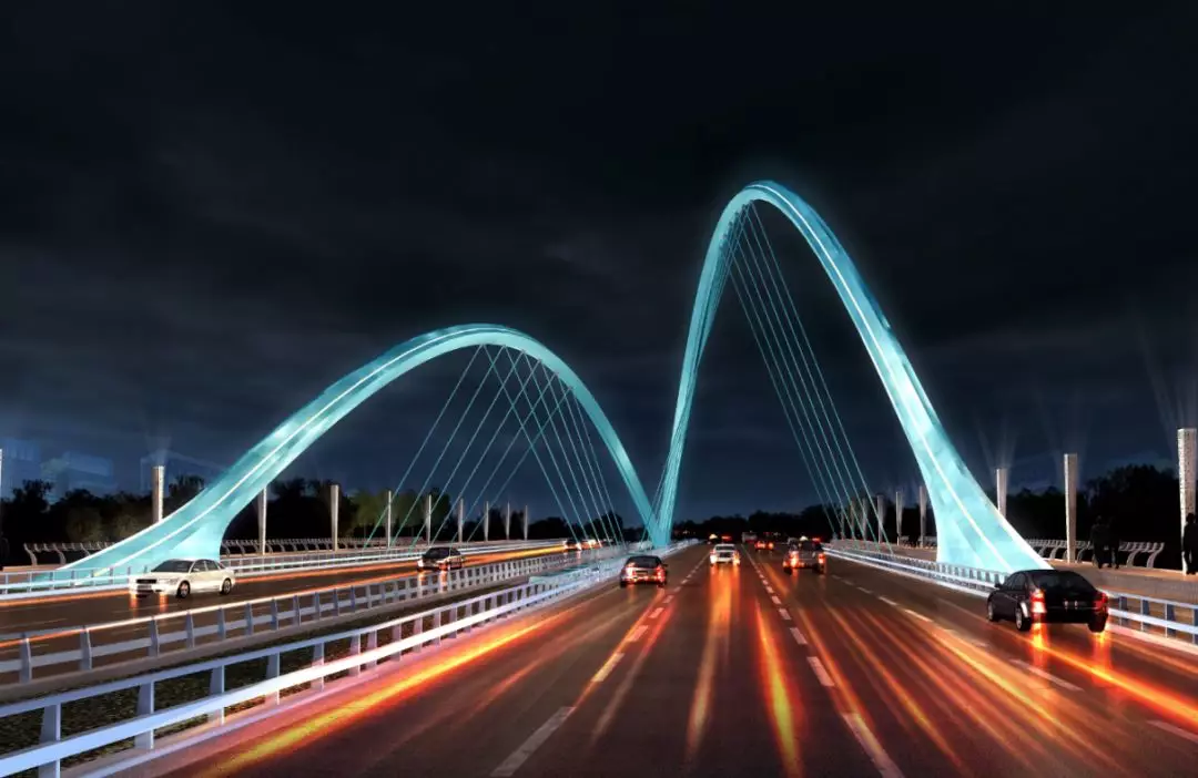橋梁結(jié)構(gòu)形式采用下承式拱橋,兩幅高低拱空間交叉,形態(tài)優(yōu)美。橋梁周邊環(huán)境較為舒朗,橋梁設(shè)計體現(xiàn)豎向視覺沖擊力,體現(xiàn)地標(biāo)性,使橋梁具有支配環(huán)境和成為景觀主題因素。