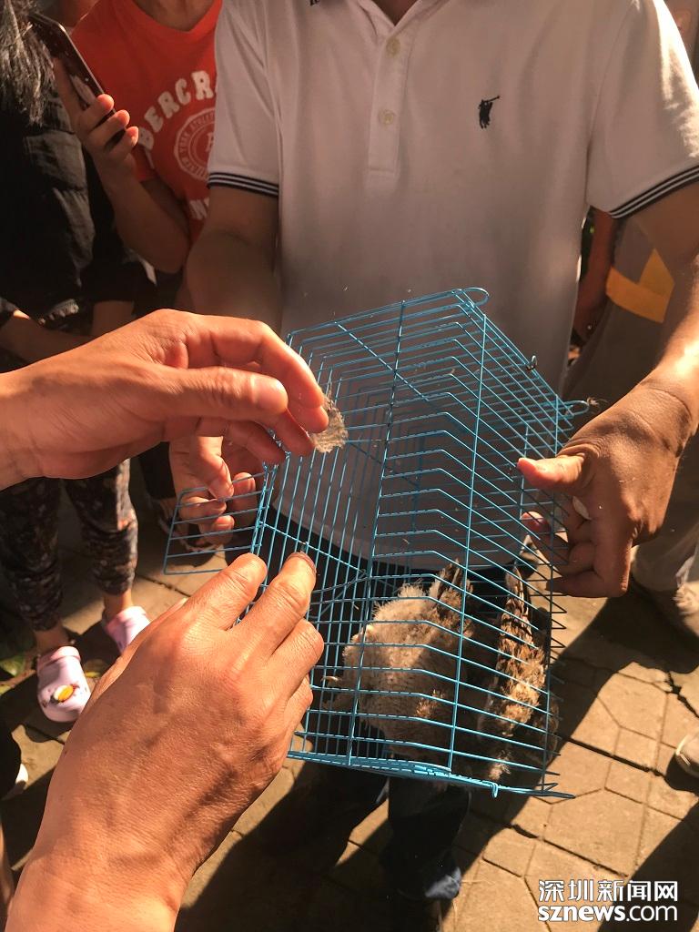 小區(qū)保安先把小貓頭鷹裝進(jìn)籠子,等待動(dòng)保所的工作人員到來。