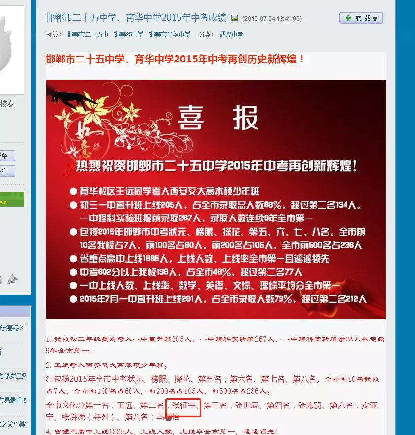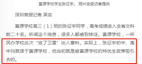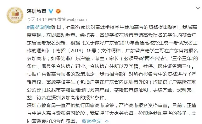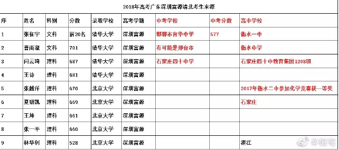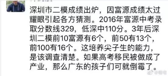 近日,深圳高三二模成績出爐,一所學(xué)校引起了深圳家長圈的高度關(guān)注。 有網(wǎng)友在微博上報料富源學(xué)校表現(xiàn)亮眼,一石激起千層浪,事件是怎么一回事呢?一起來看看 2019深二模各校尖子生成績 其中民辦學(xué)校寶安區(qū)富源學(xué)校異軍突起,尖子生占比遠超深圳最好的四大高中(深圳中學(xué),深圳實驗中學(xué),深圳外國語學(xué)校,深圳高級中學(xué)),引人注目。 網(wǎng)友議論紛紛 網(wǎng)友@相宅稱:深圳富源中學(xué),18年考中清北的學(xué)生名單和初中來源統(tǒng)計,經(jīng)過人肉搜索和大數(shù)據(jù)比對,確認相關(guān)證據(jù),有非常大的高考移民嫌疑。廣東高考本來就難,名校指標(biāo)更少,還來擠占惹起公憤。同時附上19年深圳高考二模的富源成績。今年還有沒有高考移民,還會不會擠占廣東的名校指標(biāo)? 針對網(wǎng)上的報料和家長的質(zhì)疑,深圳教育局@深圳教育回應(yīng)稱 情況說明 #情況說明#昨日,有部分家長對富源學(xué)校學(xué)生參加高考的資格提出疑問,我局高度重視,立即啟動調(diào)查。經(jīng)核實,富源學(xué)校在我市申請高考報名的學(xué)生均符合廣東省高考報名資格。根據(jù)《關(guān)于做好廣東省2019年普通高校招生統(tǒng)一考試報名工作的通知》(粵招〔2018〕15號)文件精神,廣東省戶籍學(xué)生可在廣東省內(nèi)報名參加高考;如果為非廣東戶籍,考生(家長)必須具備“兩個合法”、“三個三年”的條件,即具備合法穩(wěn)定職業(yè)、合法穩(wěn)定住所以及學(xué)籍、社保、居住證各滿三年。根據(jù)廣東省高考報名的政策規(guī)定,我市招考部門對所有報名考生的資格進行了嚴(yán)格審核。富源學(xué)校學(xué)生(包括戶籍在廣東省內(nèi)深圳市外的)均提供了戶籍所在地公安部門及我市學(xué)籍管理部門對其戶籍、學(xué)籍的審核證明,手續(xù)齊全、資料完整,符合在深圳參加高考的報名條件。 深圳市教育局一直嚴(yán)格執(zhí)行國家高考政策,嚴(yán)格高考報名資格審查。目前,正值考生進入高考緊張復(fù)習(xí)階段,我局呼吁大家關(guān)心每一位即將參加高考的孩子,共同營造良好的考前氛圍。 回應(yīng)之下,小編根據(jù)現(xiàn)有的資料,發(fā)現(xiàn)了這些信息出入,一起接著往下看! 對比:富源學(xué)校深圳一模成績 成績單顯示,在前十名單里,富源學(xué)校獨占6位,而深圳四大公辦重點高中總和也只有4位,這是什么情況?對照看一看一模成績: 三年來深圳中考錄取情況: 富源學(xué)??梢娚床徽純?yōu)勢 再來看一看三年來深圳中考錄取情況:富源學(xué)??梢娚床]有什么優(yōu)勢,總分460分的錄取分?jǐn)?shù)比四大重點低了將近100分,但也不能因此說明該學(xué)校沒有尖子生源。 2018年富源學(xué)校高考清北名單:9位同學(xué)上清北 下圖是2018年幾所大學(xué)在廣東(理科)招生計劃: 但是,這幾名考進清北的同學(xué),名字竟然出現(xiàn)在兩所不同的高中??? 考進廣東前20名的張征宇同學(xué) 網(wǎng)友爆料稱,深圳富源中學(xué)2018年高考喜報,特別宣傳了張征宇同學(xué)(后成功考入清華大學(xué))。而他也出現(xiàn)在2015年的邯鄲市育華中學(xué)中考喜報上。乾坤大挪移,坐地日行八萬里! 家長質(zhì)疑:富源中學(xué)光榮榜的同學(xué) 怎么又出現(xiàn)在衡水中學(xué)喜報上? 針對上面9位同學(xué),搜索信息顯示,竟然有五位同學(xué)來自有名的高考大省河北。 在2018年的第31和32屆化學(xué)奧林匹克競賽的名單上,有一個共同的名字:崔一龍,但他們來自不同的學(xué)校。高二時他在衡水第一中學(xué),高三他出現(xiàn)在深圳富源中學(xué)。 同時,該網(wǎng)友還發(fā)了一封 #一位深圳中學(xué)生家長寫給教育部的控訴信# 尊敬的國家教育部領(lǐng)導(dǎo): 您好! 我是深圳市一名中學(xué)生的家長。這幾日網(wǎng)上流傳出一份深圳市高三年級第二次模擬考試前幾名學(xué)校分布成績單,其中民辦學(xué)校寶安區(qū)富源學(xué)校異軍突起,遠超深圳最好的四大高中(深圳中學(xué),深圳實驗中學(xué),深圳外國語學(xué)校,深圳高級中學(xué))引起廣大家長的關(guān)注。隨后網(wǎng)上流傳出是富源學(xué)校與河北衡水中學(xué)之間的高考移民消息,具體操作是通過將河北衡水中學(xué)的尖子生戶口轉(zhuǎn)移到深圳富源學(xué)校,平時在衡水中學(xué)上課,考試在深圳富源學(xué)校,并參加深圳市高考。此情況幾年前已有,數(shù)量沒有那么大。今年突然大量此類考生出現(xiàn),大家猜測,如果不加管控未來必將愈演愈烈。 作為一名普通深圳市民和學(xué)生家長,我守法遵紀(jì),但是實在難以接受這樣的現(xiàn)實。希望教育部能夠徹查此事,查明真相,還廣大家長和考生一個公道。 記者調(diào)查 網(wǎng)上傳出深圳高三二模數(shù)據(jù)圖,記者向深圳某中學(xué)老師證實了該表格的真實性。從數(shù)據(jù)中可看到,深圳二模全市前十共有11名,其中富源6名,深圳中學(xué)3名,深圳實驗學(xué)校和市高級中學(xué)各占1名。有家長質(zhì)疑這是富源學(xué)校從衡水中學(xué)引入了高考移民,才導(dǎo)致二模成績一下子拔尖,并已申請要求有關(guān)部門徹查。 同時,小編梳理去年的報道發(fā)現(xiàn),張征宇同學(xué)此前的采訪顯示:張征宇初中、高中均就讀于富源學(xué)校,他當