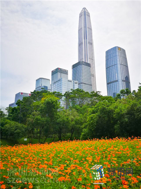 遠處的平安大廈,近處的綠樹、花海,構成了一副靜謐美好的畫面。