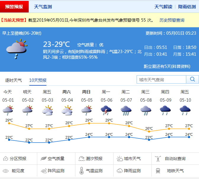 深圳新聞網2019年5月1日訊 深圳市氣象局預計1日陰天間多云,有陣雨或雷陣雨,23-29℃;2-6日多云為主,間中有短時陣雨,其中2-3日沿海、高地和海區(qū)有7-8級偏東風。