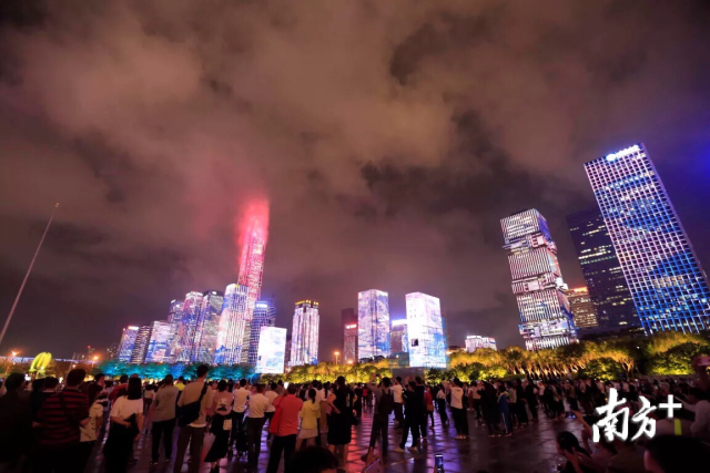 南方+客戶端2019年5月7日訊 5月1日18:40,剛剛來(lái)到深圳成為實(shí)習(xí)教師的趙同學(xué),早早在市民中心占了位置,她發(fā)了一條朋友圈:“等待市民中心燈光秀的人從眾……”50分鐘后,福田中心區(qū)的43棟樓宇閃爍起五彩斑斕的燈光,照亮了她疲憊卻興奮的臉。