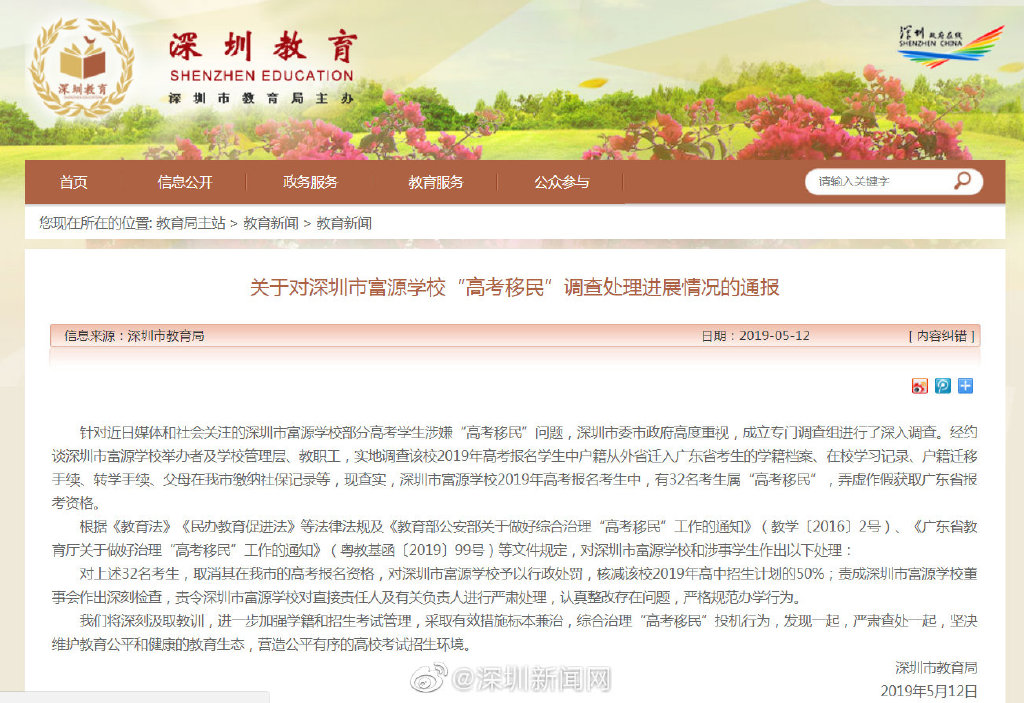 今天凌晨,深圳市教育局發(fā)布《關(guān)于對深圳市富源學(xué)校“高考移民”調(diào)查處理進展情況的通報》?!锻▓蟆啡娜缦?