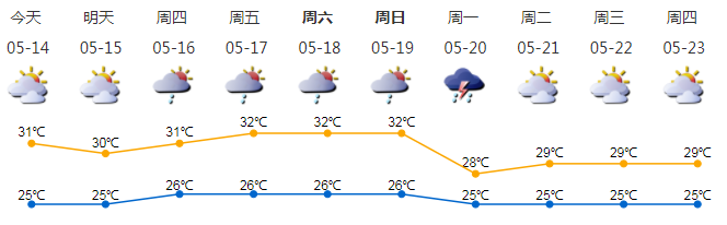 我市多云,早晚有輕霧;氣溫25-31℃;偏南風(fēng)2-3級(jí);相對(duì)濕度55%-95%
