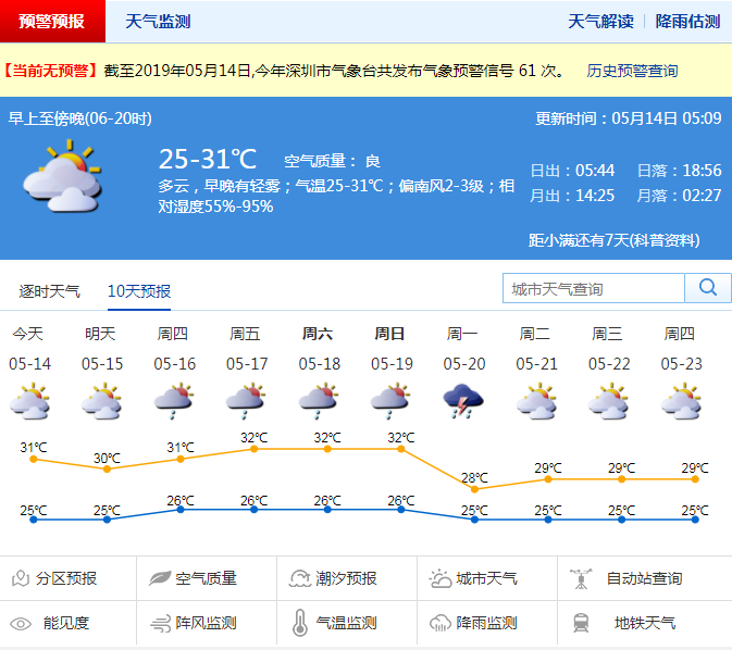 記者從深圳市氣象局了解到,14日,深圳以多云天氣為主,早晚有輕霧,氣溫在25-30℃。