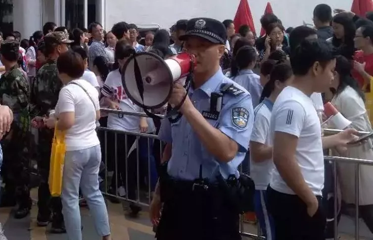 當(dāng)天在蜂擁的人群中,有一個(gè)人在家長(zhǎng)群里火了,視頻里他身穿警服,拿著喇叭在現(xiàn)場(chǎng)維持秩序。