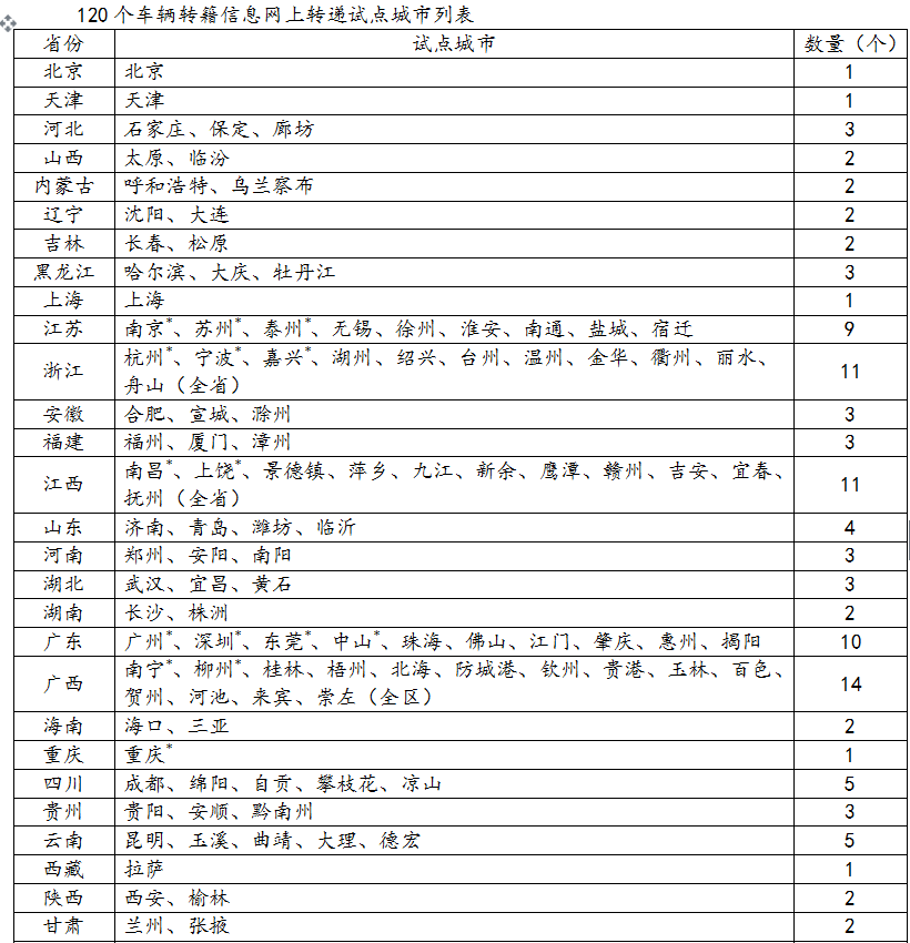 4.?dāng)U大車輛轉(zhuǎn)籍信息網(wǎng)上轉(zhuǎn)遞試點(diǎn)。在原有15個(gè)試點(diǎn)城市的基礎(chǔ)上,進(jìn)一步擴(kuò)大非營(yíng)運(yùn)小微型載客汽車檔案電子化網(wǎng)上轉(zhuǎn)遞試點(diǎn),在直轄市、省會(huì)市、自治區(qū)首府市、計(jì)劃單列市全部推行,同時(shí)各省(區(qū))至少再選擇1至2個(gè)城市推行。對(duì)機(jī)動(dòng)車在試點(diǎn)城市之間轉(zhuǎn)籍的,申請(qǐng)人可以直接到車輛遷入地車輛管理所申請(qǐng)并辦理,無需再回遷出地驗(yàn)車、提取紙質(zhì)檔案。