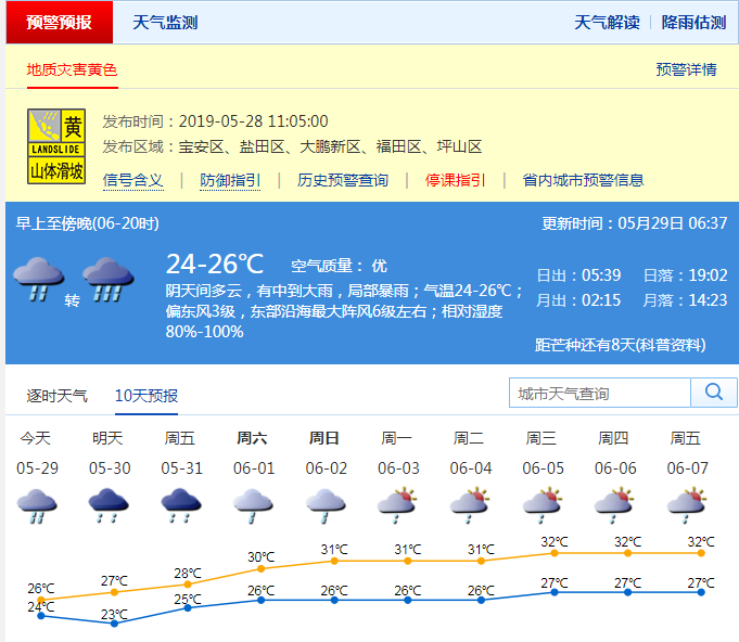 【上班天氣】預(yù)計早晨7-9時,全市陰天間多云;氣溫24-26℃,相對濕度87%-100%;早晨天氣舒適,無明顯降雨,適合外出活動;白天仍有降雨,外出注意隨身帶傘。深圳市氣象臺2019年05月29日06:06發(fā)布。