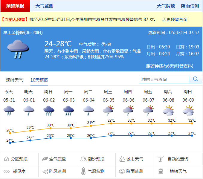 深圳新聞網(wǎng)2019年5月31日訊 記者從深圳市氣象局了解到目前我市仍處于龍舟水活躍期,31日至6月3日多局地暴雨。31日有中到大雨,局部暴雨;1日有陣雨,天氣轉(zhuǎn)趨悶熱,2-3日降雨再次加強(qiáng),有大雨到暴雨,伴有雷暴;展望4-6日,仍多陣雨。