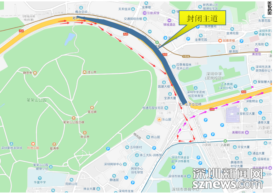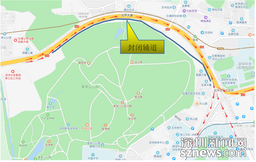 夜間封閉北環(huán)大道主道時(shí),主道車(chē)輛合流至輔道2車(chē)道直行至上步北路經(jīng)羅湖、鹽田右轉(zhuǎn)出口匝道后往泥崗西路東行或擇周邊其他道路通行;而夜間封閉北環(huán)大道輔道時(shí),輔道車(chē)輛合流至主道3車(chē)道直行至上步立交處右轉(zhuǎn)輔道臨時(shí)出口,車(chē)輛可選擇臨時(shí)開(kāi)設(shè)出口或周邊其他道路通行。