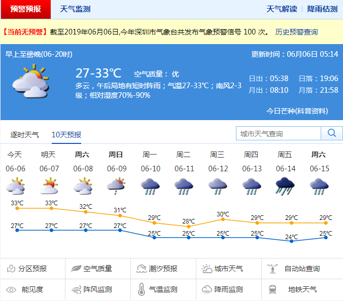 深圳新聞網(wǎng)2019年6月6日訊 今天白天,全市多云,午后局地有短時陣雨;氣溫27-33℃;南風(fēng)2-3級;相對濕度70%-90%。天氣炎熱,市民外出請注意防暑降溫,參加戶外活動時需及時補充水分。