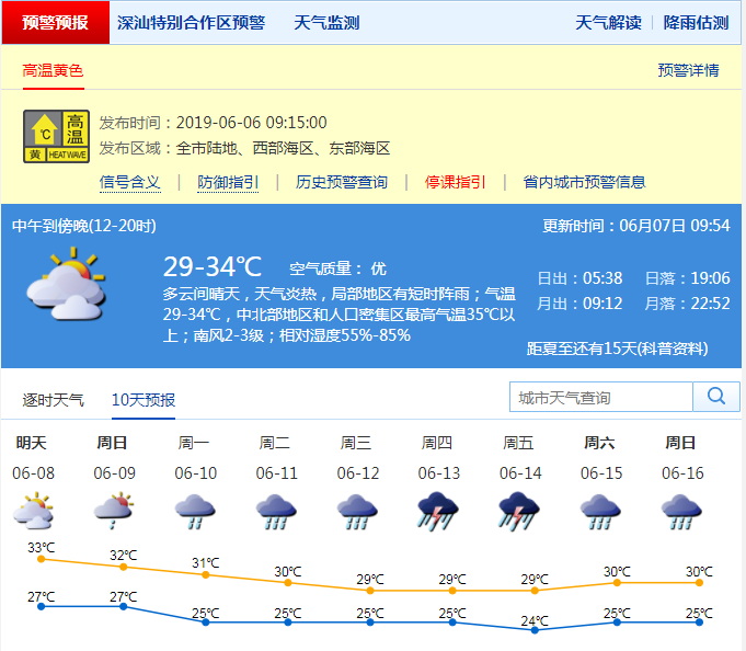 深圳新聞網(wǎng)2019年6月7日訊 記者從深圳市氣象局了解到,7日多云間晴,天氣炎熱,局地有短時陣雨;氣溫28-34℃,中北部地區(qū)和人口密集區(qū)最高溫度將達到35℃以上;南風(fēng)2-3級;相對濕度75%-90%。7-8日晴天間多云,有局地短時(雷)陣雨,最高氣溫34℃,中北部和人口密集區(qū)35℃或以上;9日有雷陣雨,局部大雨;10日起進入新一輪龍舟水降雨集中期。