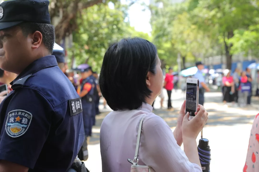 △考場外焦急等待的考生家長紛紛拿出手機準備拍攝邁出考場的孩子。