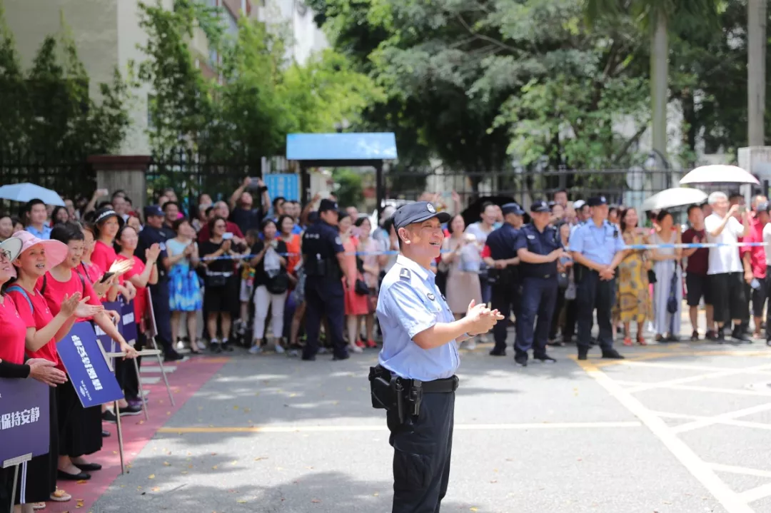 △當?shù)谝晃豢忌叱錾钲趯嶒瀸W校中學部考場時,通心嶺派出所所長林志強與現(xiàn)場家長為其鼓掌喝彩。