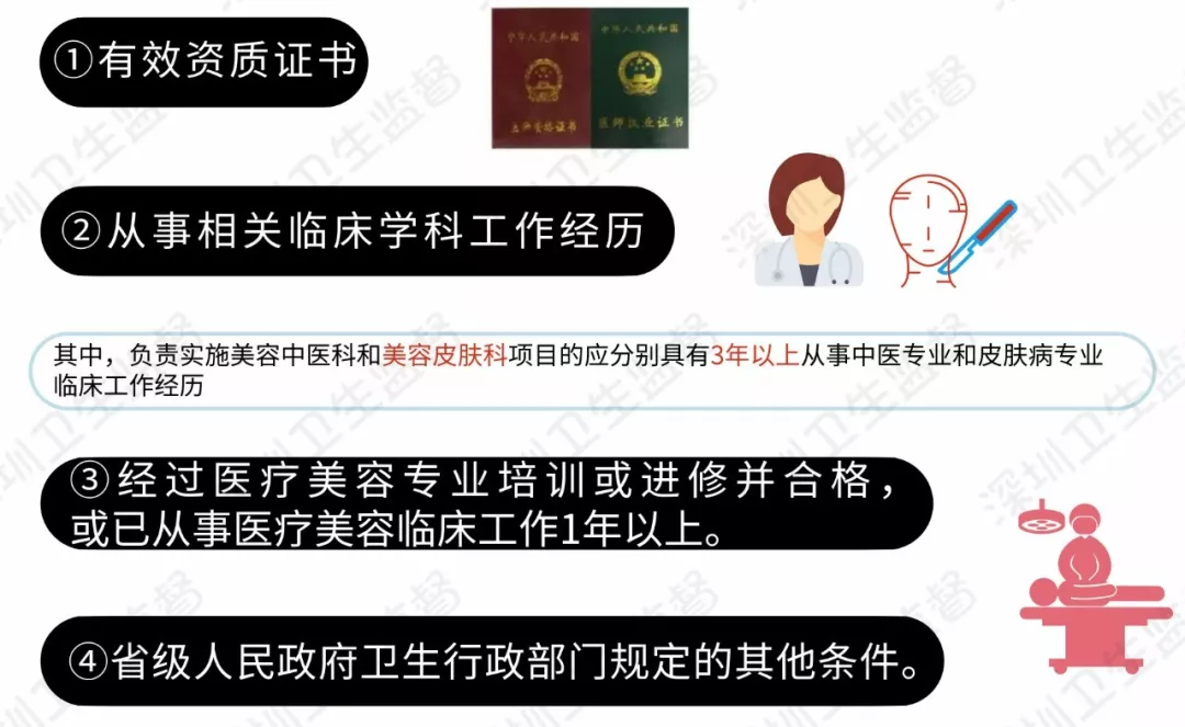 (二)具有從事相關(guān)臨床學(xué)科工作經(jīng)歷。其中,負(fù)責(zé)實施美容外科項目的應(yīng)具有6年以上從事美容外科或整形外科等相關(guān)專業(yè)臨床工作經(jīng)歷;負(fù)責(zé)實施美容牙科項目的應(yīng)具有5年以上從事美容牙科或口腔科專業(yè)臨床工作經(jīng)歷;負(fù)責(zé)實施美容中醫(yī)科和美容皮膚科項目的應(yīng)分別具有3年以上從事中醫(yī)專業(yè)和皮膚病專業(yè)臨床工作經(jīng)歷;(三)經(jīng)過醫(yī)療美容專業(yè)培訓(xùn)或進(jìn)修并合格,或已從事醫(yī)療美容臨床工作1年以上;(四)省級人民政府衛(wèi)生行政部門規(guī)定的其他條件。