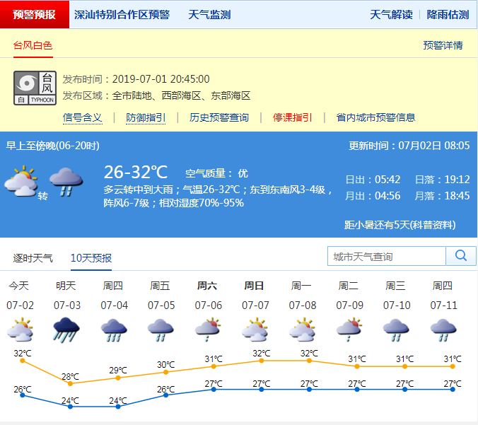 深圳新聞網2019年07月02日訊 深圳市氣象臺已于昨日20時45分發(fā)布臺風白色預警信號,預計其將可能在48小時內影響我市,全市進入臺風注意狀態(tài)。氣象臺預計,今日白天深圳風力逐漸加大,最大陣風7級左右,午后降雨漸趨頻密,局部大雨,夜間降雨加大,有大雨到暴雨,局部大暴雨,請做好防范準備!