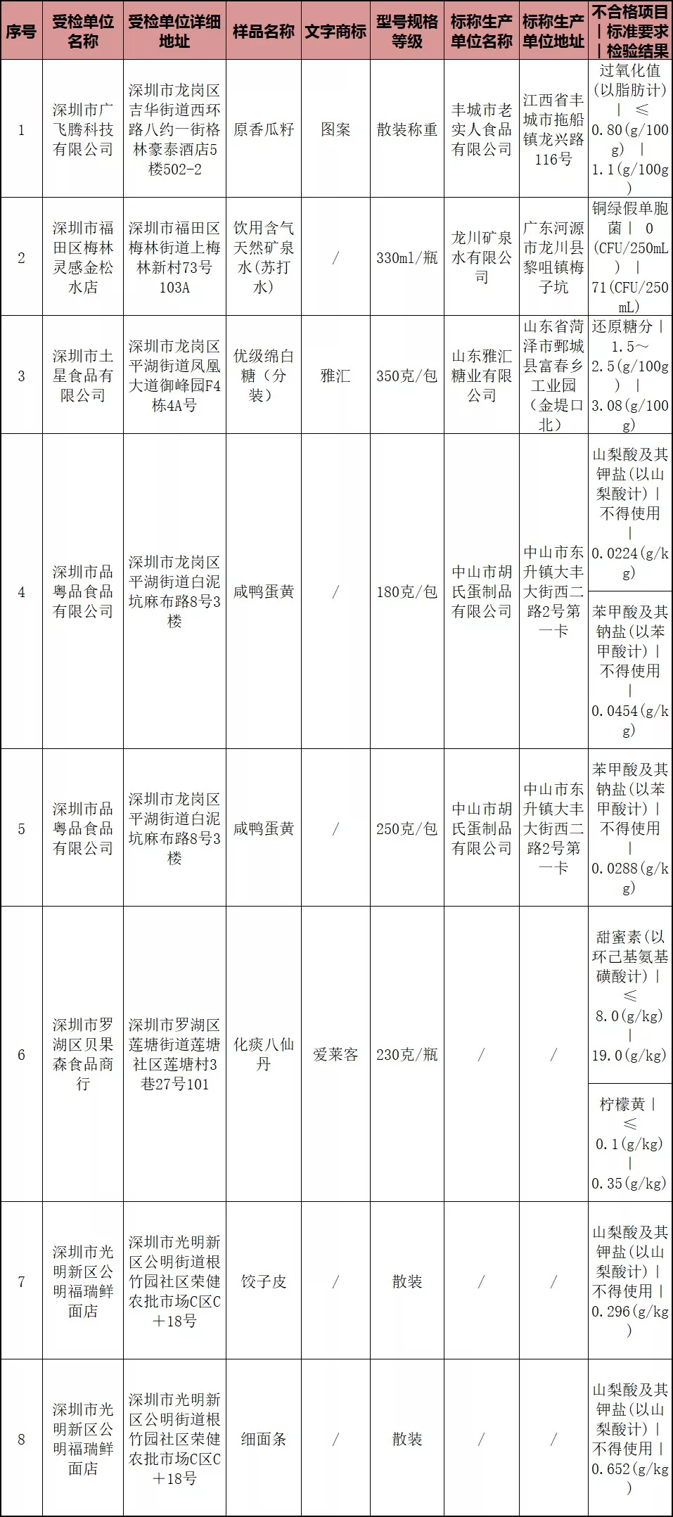 本次抽檢不合格食品