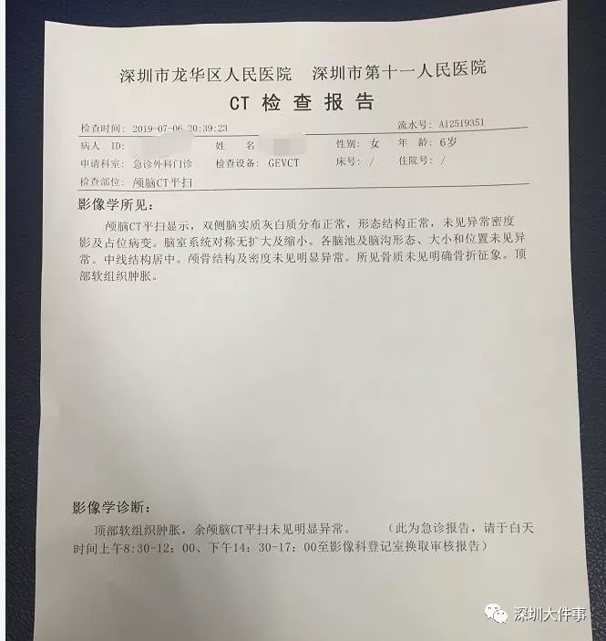 據(jù)市民李女士報料稱,7月6日晚上8時許,在龍華區(qū)弓村一巷一位6歲女童被樓上掉下的瓶子砸中頭部,血流不止。隨后女童被父母送往附近社康醫(yī)治,但因傷口太深社康無法治療,遂被送往龍華人民醫(yī)院救治。