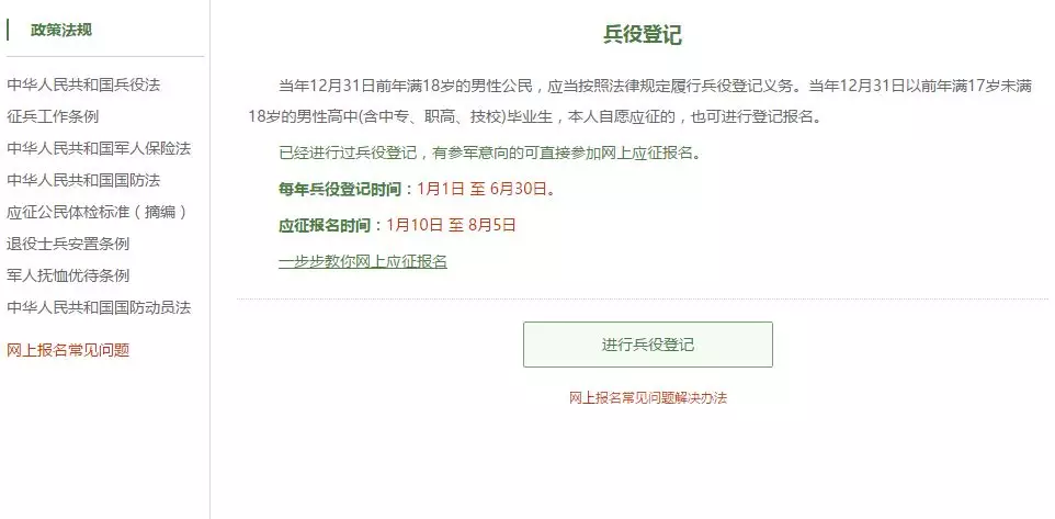 在這個(gè)頁面中,會告知我們報(bào)名時(shí)間以及參軍的政策說明,建議看后,點(diǎn)擊“進(jìn)行兵役登記”,邁出你軍旅生涯的第一步吧!