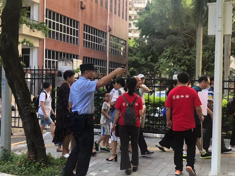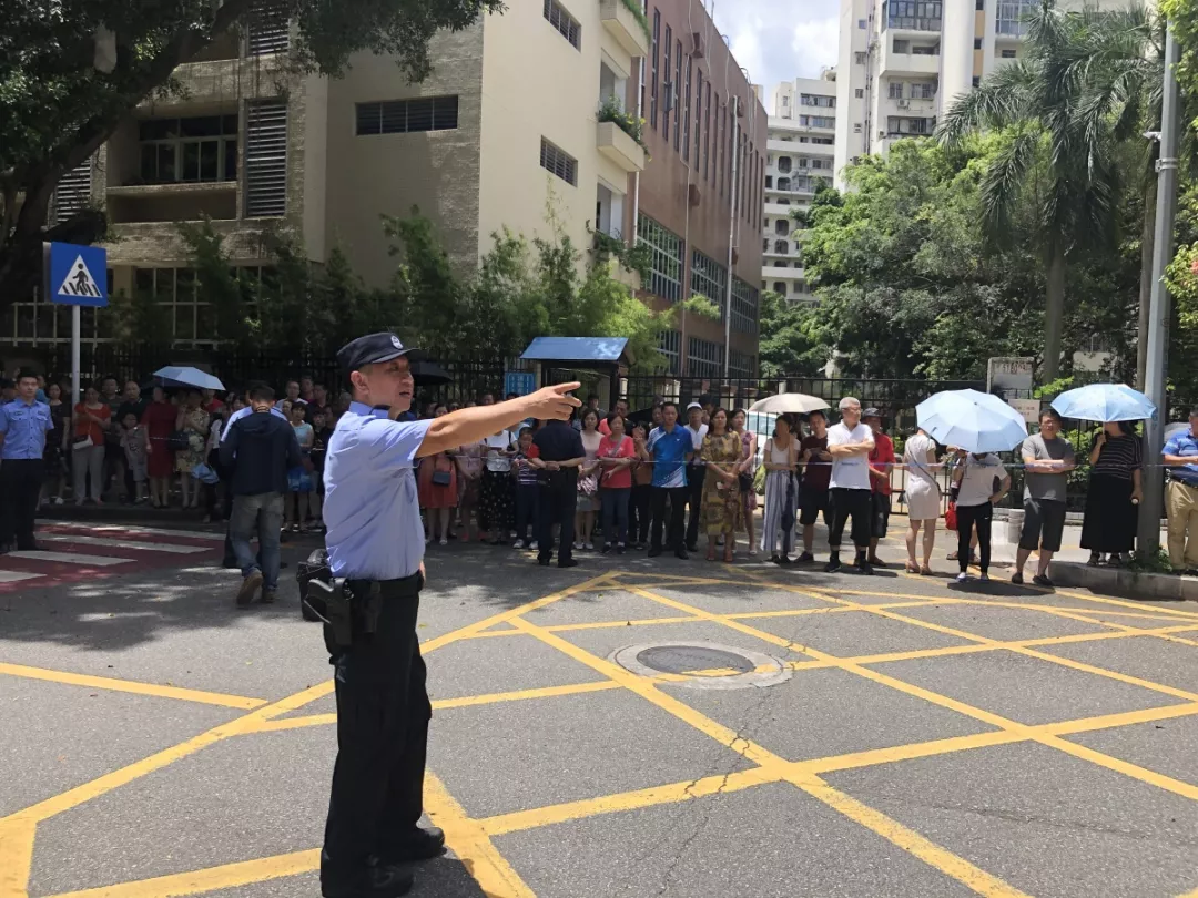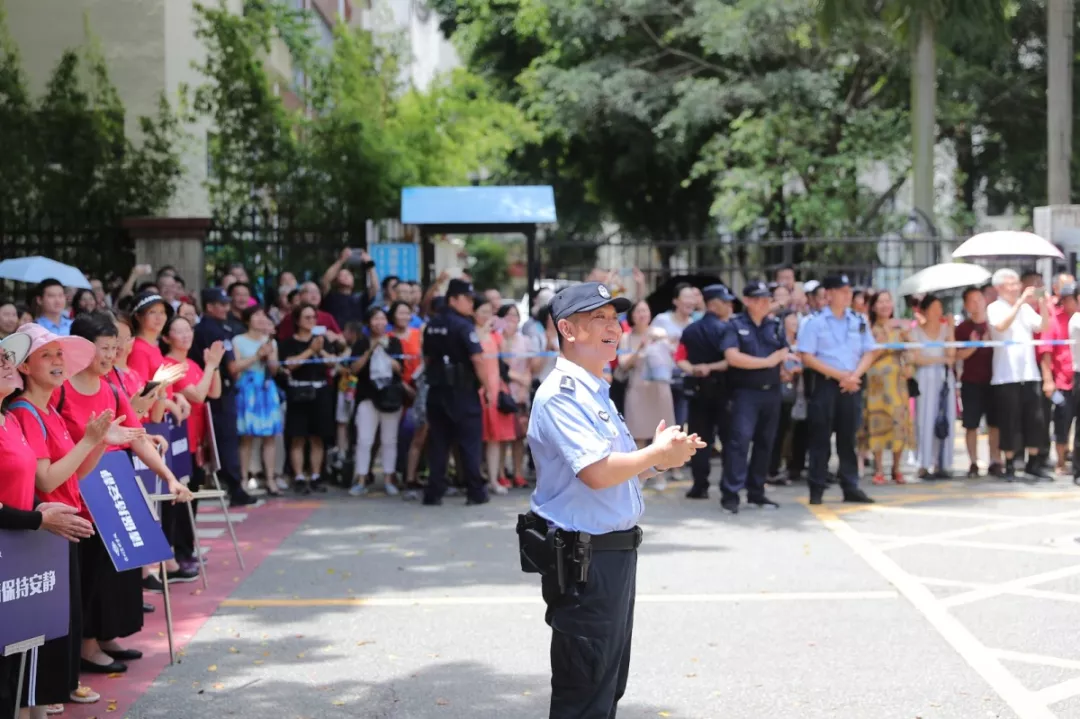 在深圳實(shí)驗(yàn)中學(xué)的校門外,正在執(zhí)勤護(hù)考的通心嶺派出所所長林志強(qiáng)正跟送考的家長們“嘮嗑”。“大家都站這么久了,辛苦了!一會(huì)考試結(jié)束后,咱們來猜一猜第一個(gè)走出來的是男生還是女生?!薄拔也率悄猩!薄拔也率桥??!奔议L們一掃臉上焦急的表情,開始笑著討論起來。