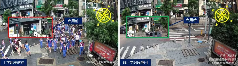羅湖黃貝/德智路口上下學期間采取燈控設置,規(guī)范路口內行車秩序,保證機動車與行人的安全。因暑期行人、機動車流量均明顯減少,蜀黍采取全天黃閃控制,提高機動車通行效率。