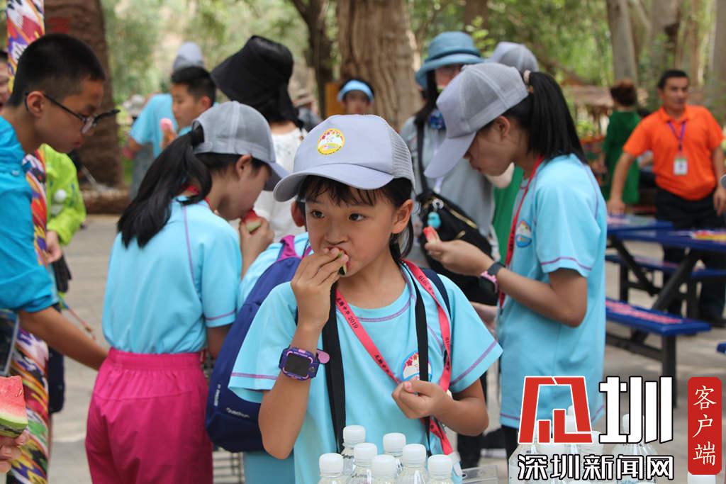 學生們在品嘗吐魯番的西瓜。(深圳新聞網(wǎng) 記者吳梓欣攝)